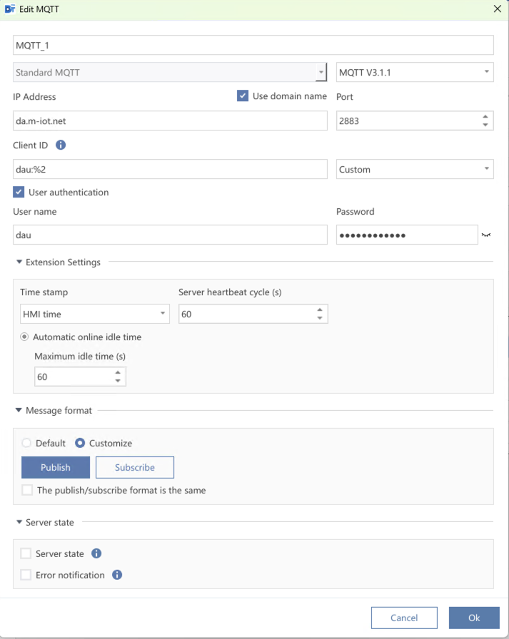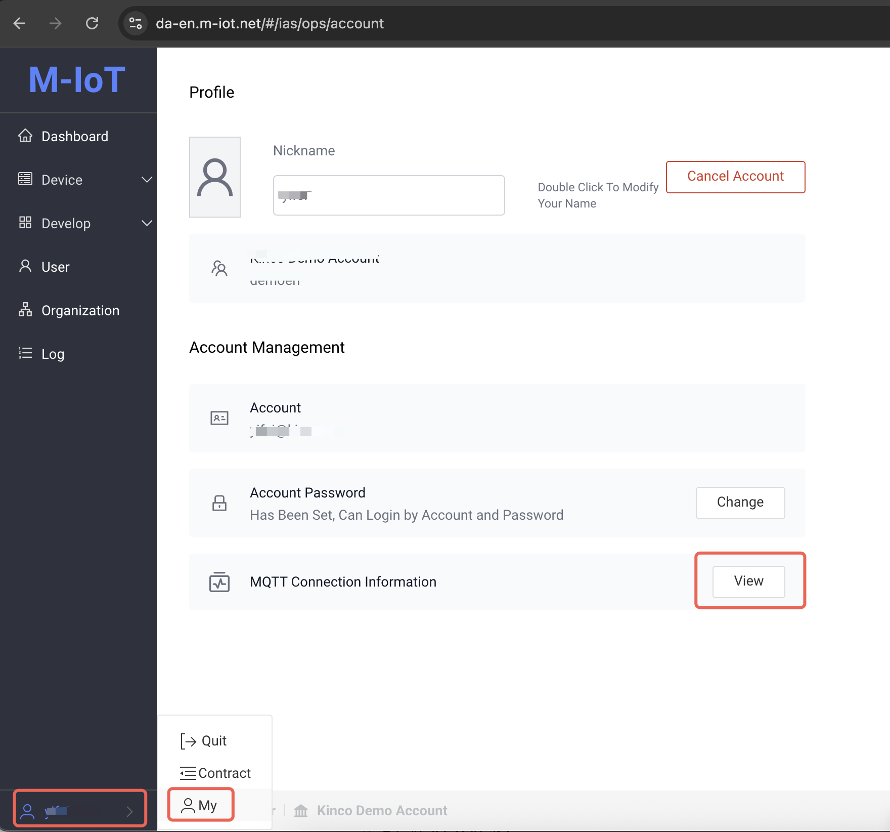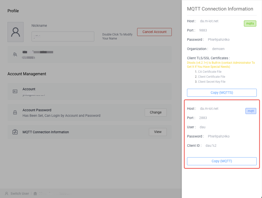 - Password: Check the MQTT connection information in the cloud platform personal information
